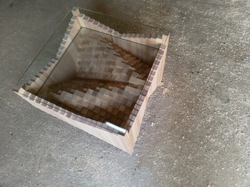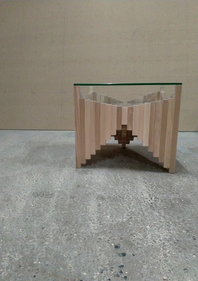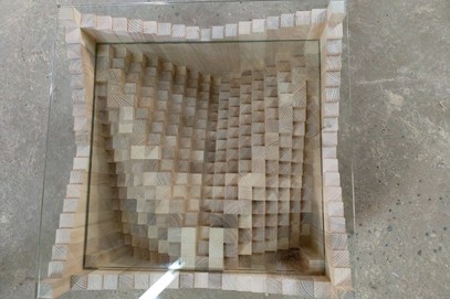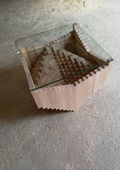 Table basse composée de 361 morceaux de frêne, deux verres de 10 mm d’épaisseur. 57 * 57 cm et d’une hauteur de 49 cm. Les pièces sont assemblées une par une, quelques nombreuses heures de travail…